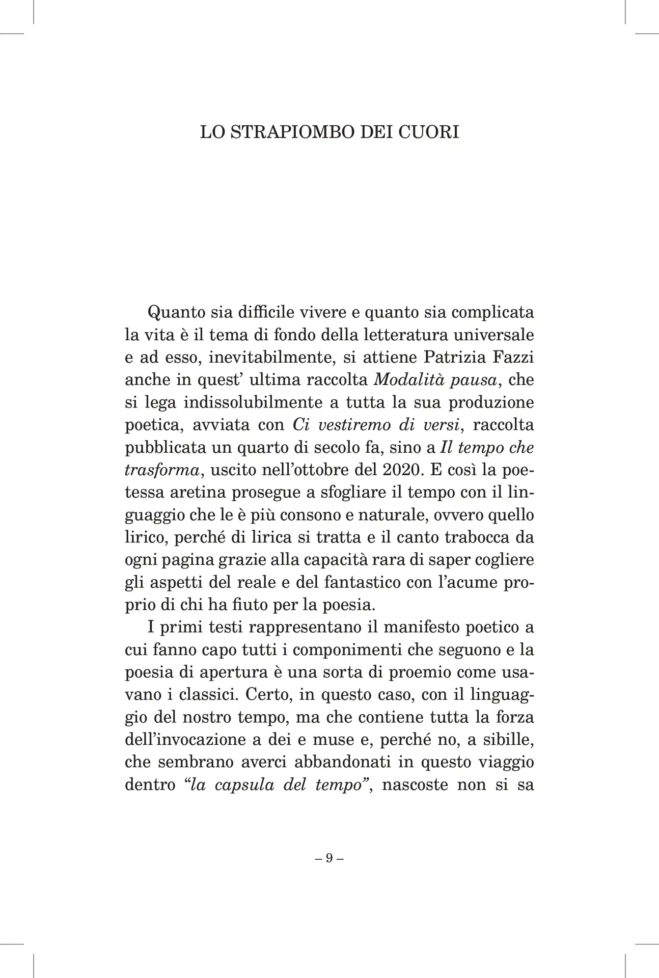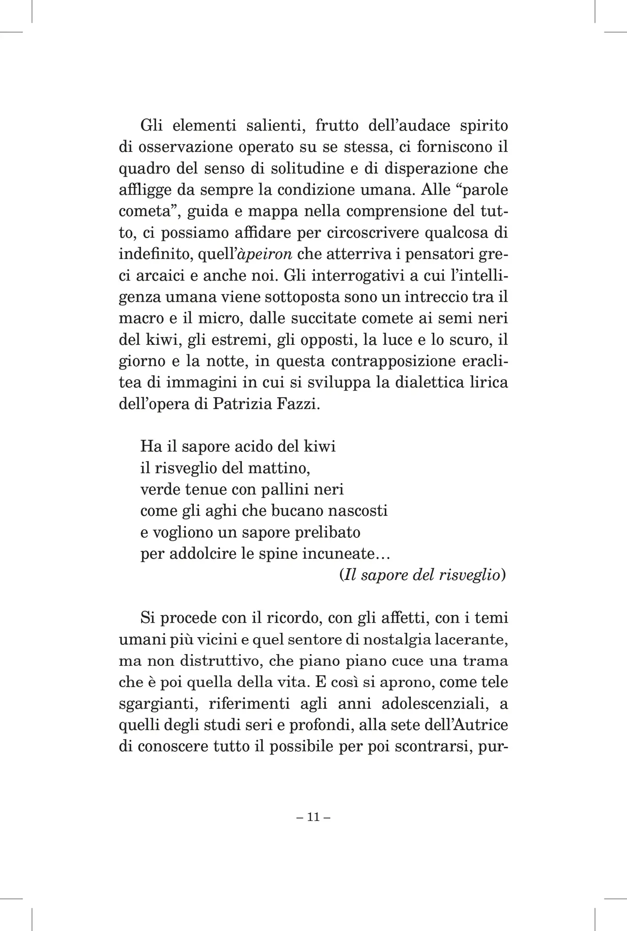 Patrizia Fazzi è nata e vive ad Arezzo. Già docente di Materie Letterarie e Latino, fa parte di varie associazioni culturali e di giurie letterarie. Ha pubblicato le raccolte Ci vestiremo di versi, Helicon, 2000; Dal fondo dei fati, Edizioni del Leone, 2005; La conchiglia dell’essere – Poesie per Piero della Francesca, Le Balze, 2007 (ristampato in edizione ampliata, Polistampa 2009, anche in lingua inglese, The Shell of Being); Il filo rosso – Segno e simbolo nell’arte di Giampaolo Talani, Polistampa, 2008; L’occhio dei poeti, Edizioni del Leone, 2011; Finché ci sarà una nota, Prometheus, 2018; Il tempo che trasforma, Prometheus, 2020. È autrice del filmato Cuneo di luce dedicato alla Cappella Bacci, 2015 e, insieme ad Anna Bartolini, della monografia Villa degli Orti Redi – Un giardino aretino da riscoprire, Prometheus, 2016. Ha scritto saggi critici pubblicati in Atti dell’Accademia Petrarca, Nuova Antologia, Studi italiani e in riviste e siti letterari con cui collabora. Su quotidiani e riviste nazionali sono comparse recensioni alle sue opere, presentate in sedi nazionali e internazionali.